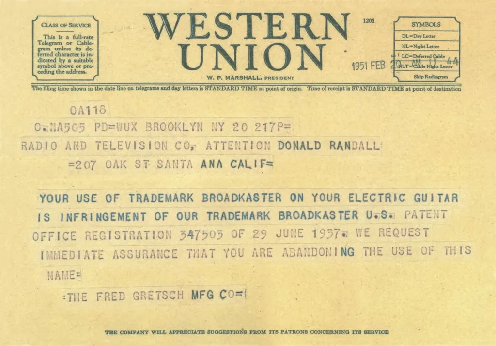 In February 1951, Gretsch sent a Western Union telegram demanding Fender drop the name—claiming trademark infringement. Don Randall (Fender’s GM) responded quickly, telling salesmen to stop using “Broadcaster” immediately. He asked for suggestions: “If any of you have a good name in mind I would welcome hearing from you immediately.”